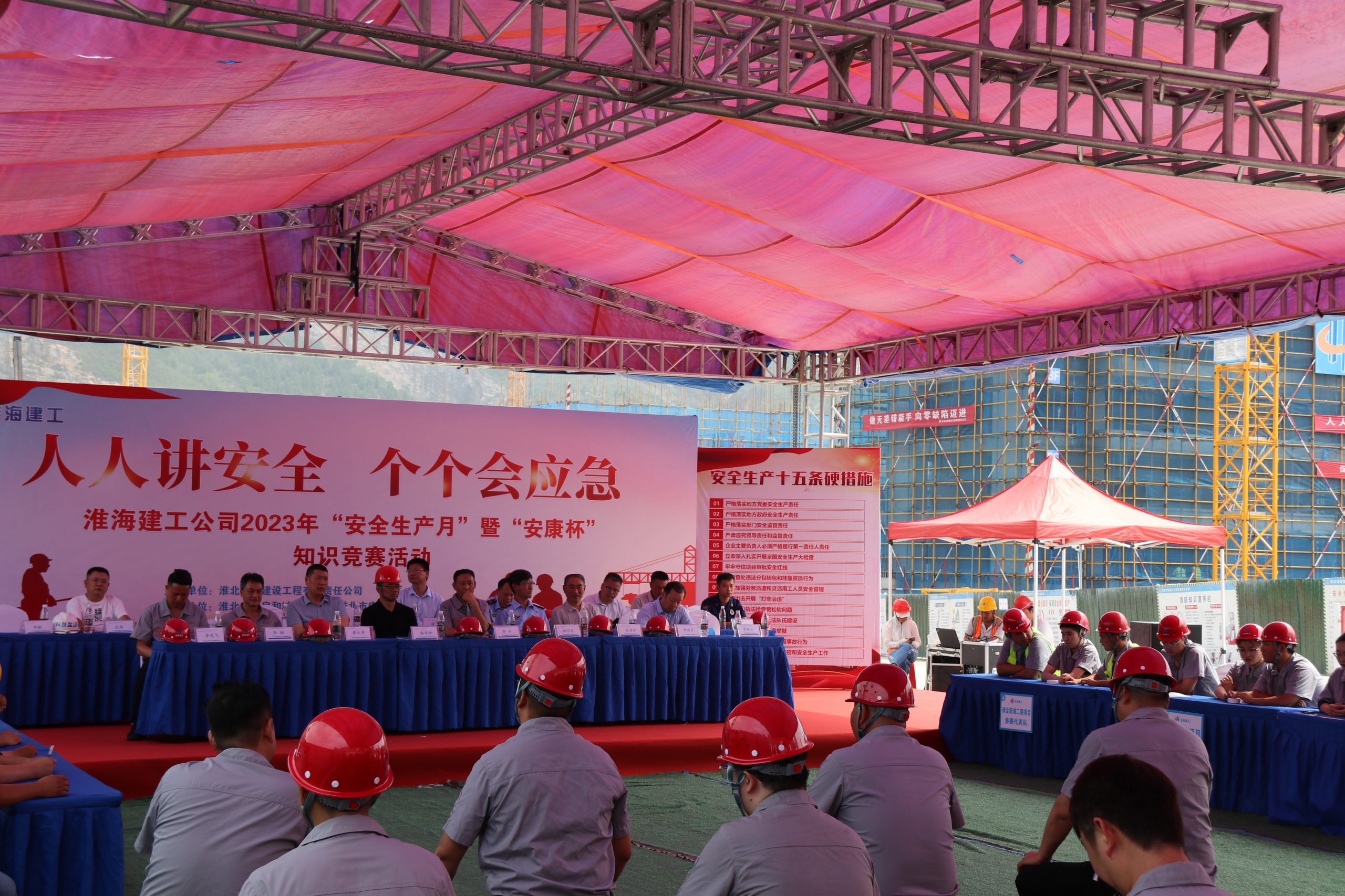 為深入貫徹落實(shí)習(xí)近平總書(shū)記關(guān)于安全生產(chǎn)工作的重要講話指示以及近期省、市、集團(tuán)安全生產(chǎn)會(huì)議精神,切實(shí)增強(qiáng)公司全體員工安全防范意識(shí)和應(yīng)急救援能力,6月20日上午,淮海建工公司在熙園項(xiàng)目部舉辦2023年“安全生產(chǎn)月”暨“安康杯”知識(shí)競(jìng)賽活動(dòng),市住建局等相關(guān)部門領(lǐng)導(dǎo)出席活動(dòng)。