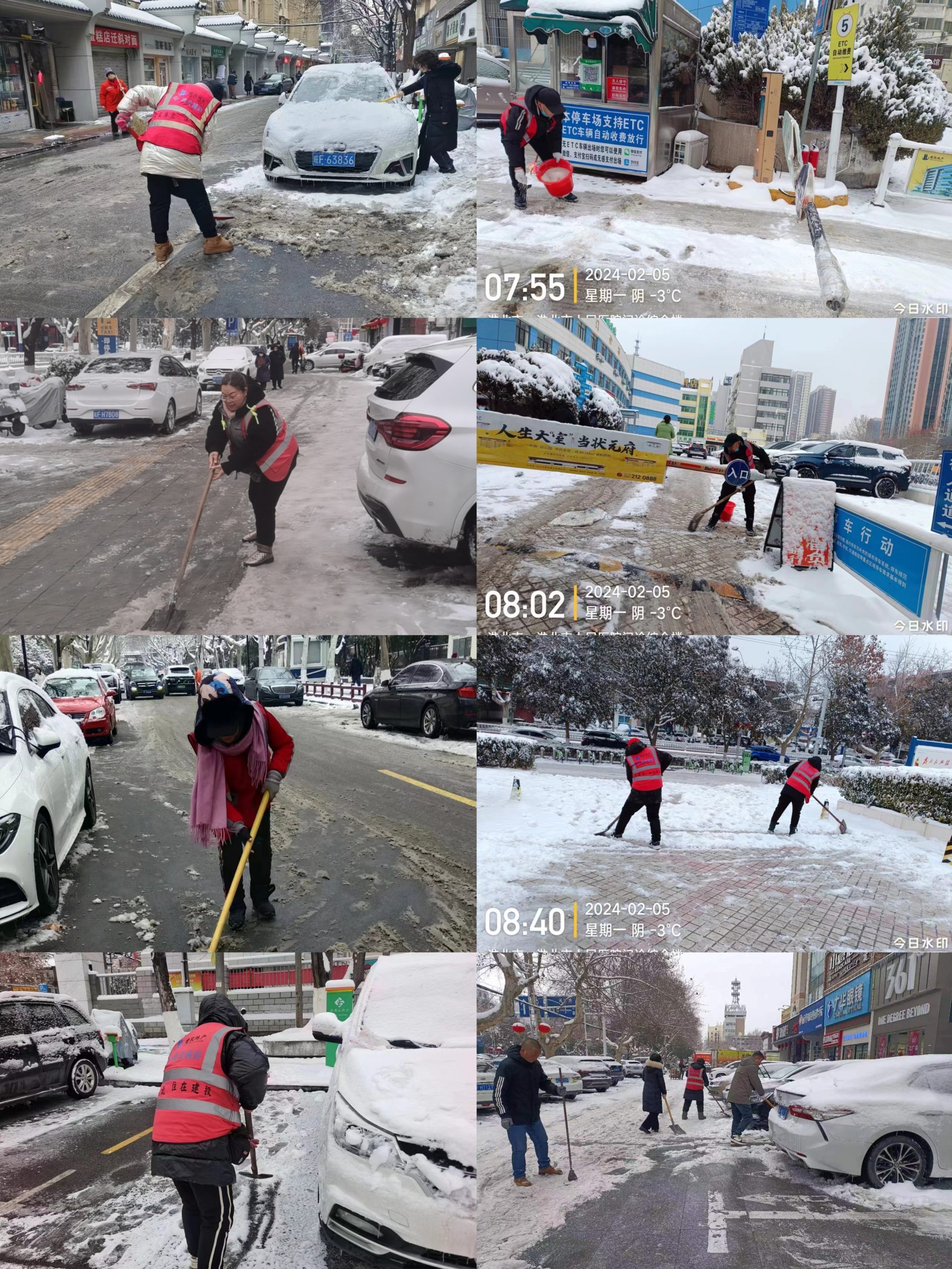 工作人員帶著鐵鍬雪鏟,充分發揮黨員模范帶頭作用,不畏嚴寒、沖鋒在前,積極參與除雪融冰、道路清潔。每個人分區清掃停車場出入口和路面人行道上的積雪,針對已經結冰的路面,工作人員使用除冰劑進行清除。大家齊心協力,為停車場及路面車道車輛出入開辟了一條安全暢通路。