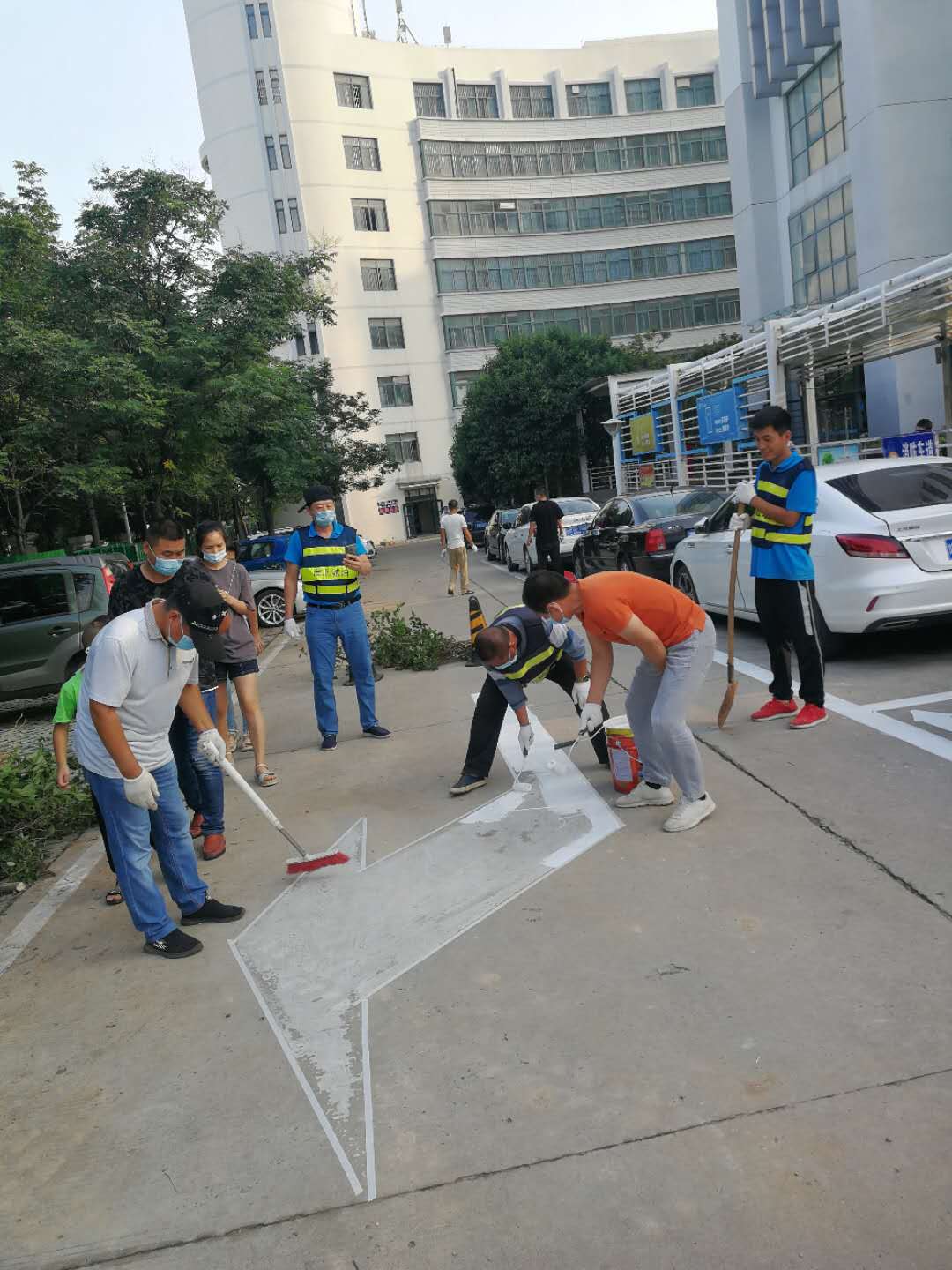 由于人民醫院住院部停車泊位緊張、車輛停放密集,施工必須在停放車輛駛出清場后,才能進行。為了不影響市民停車避開停車高峰,公司工作人員需要在中午、凌晨乃至半夜進行劃線任務。雖然辛苦,但是我們畫起線來一絲不茍,為了減少雨水對停車線的侵蝕,畫停車線時反復多次施劃增加耐久度,為了整齊美觀,施劃每一條線時都會用標尺認真的比量。看似簡單的復描劃線工作,實際上仍存在很大的工作阻力,市民因為不能第一時間停車有所抱怨對我們工作人員的工作造成了一定的困擾,但是我們依舊積極協調、解釋和溝通,圓滿的完成了復描任務,讓原本斑駁的車位線煥然一新。
