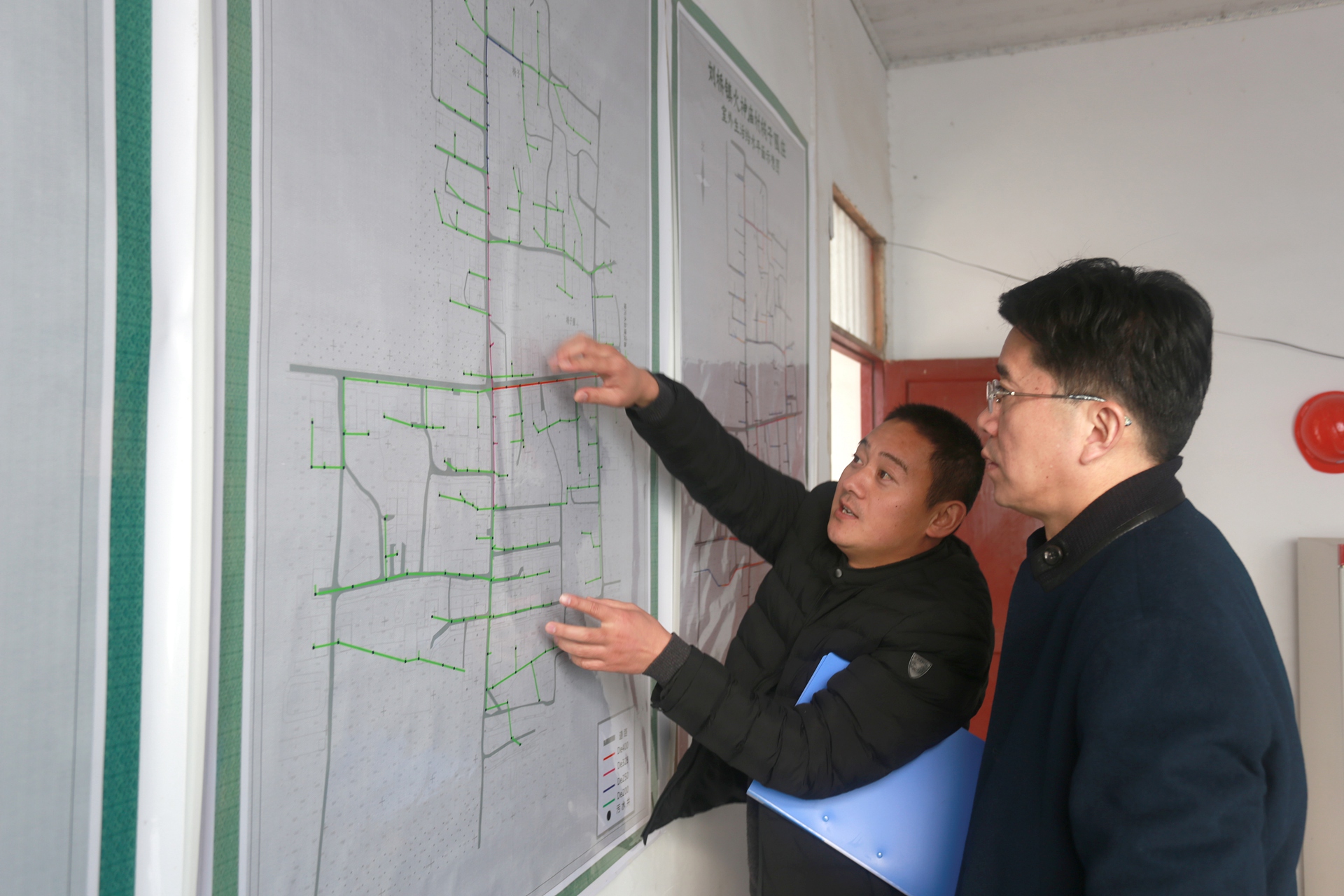 王獻忠現場查看了椅子圈莊給排水廁改工程規劃施工圖,實地勘察工程進展情況。與村干部、施工單位、監理交流了解工程質量、時間節點,詳細詢問項目落實過程中的困難和問題,現場交辦解決問題。
